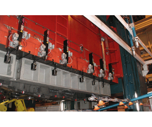 プレスラインにおけるプッシュチェーン式ラピッドクランプシステム。