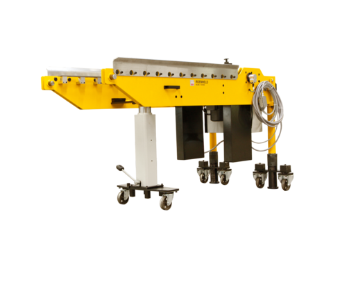 金型交換コンソールの主要な構成部品は、手動で移動可能なキャリアコンソールと電動式プッシュチェーン駆動装置です。特殊なプッシュチェーン駆動装置を備えた金型交換ステーションは、金型の取り扱いを容易にし、最大50トンの重量の金型をアクセスが困難な場所でも労力と時間を節約して交換可能です(より高い荷重は要相談)。プレスベッドのT溝に設置されたローラーとボールバーにより、金型の移動時の操作が容易です。キャリッジコンソールには、フックへのドッキングを容易にする足踏み式油圧リフティングコラムが装備されています。ステアリングローラーにより、システム全体を1つの設置場所から次の設置場所へ容易に輸送可能です。タンデム金型交換も可能です。これにより、セットアップ時間を最適化できます。
