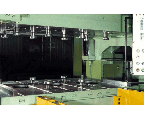 ダブルコラムプレス機のプレスベッドに設置されたプルクランプ。プレスベッドのT溝に挿入されたローラーバーを使った金型の搬出入。